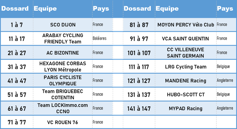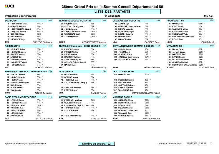 Ci-dessous, les 15 équipes présentes au 38ème Grand Prix de la Somme - Conseil départemental 80
